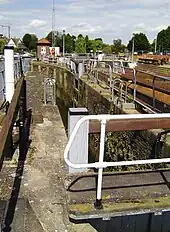 ![]() Teddington Lock undergoing maintenance. From left to right – rollers, skiff lock, launch lock and barge lock | |