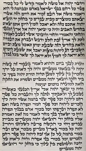 The passages are written by a scribe with special ink on parchment scrolls (klaf).[5] These are: "Sanctify to me ..." (Exodus 13:1–10); "When YHWH brings you ..." (Exodus 13:11–16); "Hear, O Israel ..." (Deuteronomy 6:4–9); and "If you observe My Commandments ..." (Deuteronomy 11:13-21).[5] The Hebrew Ashuri script must be used and there are three main styles of lettering used: Beis Yosef – generally used by Ashkenazim; Arizal – generally used by Hasidim; Velish – used by Sefardim.[46]