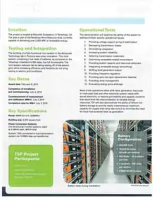 Upon commissioning, TSP was selected as a finalist for the 2014 Innovation Award for Energy Storage North America (ESNA) and elected to the ESNA Hall of Fame.[59][60] Later in 2014, TSP was included in Innovations Across the Grid published by the Edison Foundation Institute for Electric Innovation, which described how the distribution grid is evolving to optimize the electric grid, integrate new resources, and provide customer solutions.[61] TSP was featured as a real-life, new energy resource case study.[61]