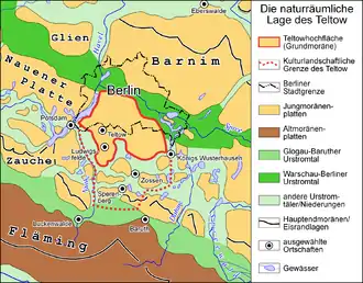 The Havel river separates the Teltow from the Nauen Plateau to the northwest. The Nuthe-Nieplitz Lowland, an urstromtal feature, separates it from the sander plateau of the Zauche in the southwest and the Berlin Urstromtal forms the boundary with the Barnim Plateau in the northeast.