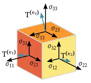 The second-order Cauchy stress tensor describes the stress experienced by a material at a given point. For any unit vector , the product is a vector, denoted , that quantifies the force per area along the plane perpendicular to . This image shows, for cube faces perpendicular to , the corresponding stress vectors along those faces. Because the stress tensor takes one vector as input and gives one vector as output, it is a second-order tensor.