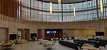 The Maanjiwe nendamowinan building, abbreviated MN, is the newest building at UTM, and was built in place of the demolished North building. The building was opened in September 2018 as the New North building. On August 22, 2019, the university announced that the building would be renamed to Maanjiwe nendamowinan after consulting with the Mississaugas of the Credit First Nation. The name means "gathering of minds" in the Anishinaabemowin language.[46][47] Maanjiwe nendamowinan has a floor space of 20,500 square metres (220,600 sq ft) and is six stories tall. MN has a Leadership in Energy and Environmental Design (LEED) Silver certification for its sustainability features, including rainwater recycling, energy-efficient mechanical systems, a green roof, and bird-safe glass.[48] In 2021 it won a Citation Award from the American Institute of Architects (AIA), Canada Society chapter.[48] Also in 2021, the building received an Award of Merit from the City of Mississauga Urban Design Awards.[49]