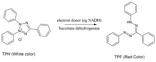 In the TTC assay (also known as TTC test or tetrazolium test), TTC is used to differentiate between metabolically active and inactive tissues. The white compound is enzymatically reduced to red TPF (1,3,5-triphenylformazan) in living tissues due to the activity of various dehydrogenases (enzymes important in oxidation of organic compounds and thus cellular metabolism), while it remains as white TTC in areas of necrosis since these enzymes have been either denatured or degraded.