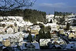 Teufen (Tiuffen) was first mentioned in 1272. By 1300 the place consisted of only five farms. In 1525 the assembly ruled that each parish could decide whether or not to remain Catholic. This led to the division of Appenzell in 1597. While the town of Teufen adopted the new protestant faith, Wonnenstein Friary remained Roman Catholic. In 1870 the Friary grounds were declared an exclave of Appenzell Innerrhoden.[3]