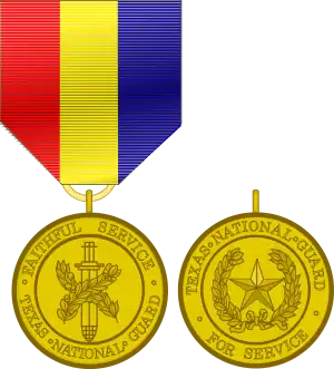 DescriptionThe ribbon drape is of red, old gold, and blue stripes. The medal is bronze with an emblem with crossed olive and live oak branches and the words "Faithful Service" and "Texas National Guard" on the obverse. The reverse contains the Coat of Arms of Texas and the words "Texas National Guard" and "For Service".
