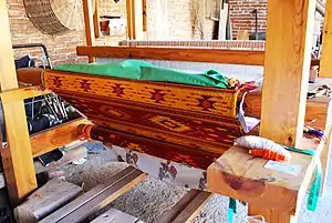 Two types of looms are employed in the making are handcrafted fabrics, the pre-Hispanic backstrap loom and the introduced European foot pedal loom. Traditionally, weaving, especially on the backstrap loom, was considered to be women's work. Women still produce items such as kitchen cloths, tablecloths, carrying bags and ornamental items with traditional designs. Although considered primitive, the backstrap loom is versatile and allows for different techniques and combinations of techniques, some of which can be very complicated. It allows for the combining of different fibers such as cotton with wool or silk.[7] Designs are woven into the cloth on this loom by changing thread colors and/or by adding items such as shells or other matter into the finished product. The backstrap loom is most prevalent in the south of the country.[1]