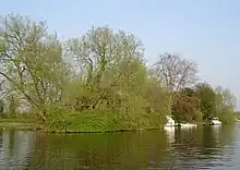 Swan Island is the smallest of the three islands. (51°23′34.5″N 0°19′50″W / 51.392917°N 0.33056°W / 51.392917; -0.33056 (Swan Island)) On it was once the ferryman's hut, recently rebuilt by the present owner. Local historian Philip J. Burchett surmised that the original incumbent must have passed a meagre life, taking people across the main stream and to and from the island for a small fee at all times of the day and night.[2] After flooding removed part of the upstream end of the main island, Swan Island has become linked to it by a bridge of vegetated sediment at normal flows.