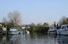 The first wooden bridge over the river at Hampton Court opened in 1753[3] and had a toll collected by a bridge-keeper. A ferry remained at the Swan Inn near the islands until at least 1911, and charged less than the toll.[1][4] The original rather rickety bridge was replaced by a more substantial timber one in 1778. In 1865 this was replaced by a steel and brick bridge, and in 1933 this was in turn replaced by the existing concrete structure. The Thames locks began to appear late in the 18th century, 'Moulsey' (today called Molesey) was built in 1815.[2]