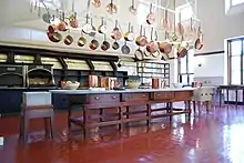 • Kitchen – The kitchen, unlike others in the time period, was situated on the first floor away from the main house to prevent the possibility of fires and cooking smells reaching the main parts of the house. The well-ventilated room supports a 21 ft (6.4 m) cast iron stove, which heats up as a single element through a coal burning stove. The work table is made of zinc, a metal which served as the forerunner to stainless steel; in front of it is a marble mortar used to crush various ingredients. Ice cut in winter from the local ponds kept the side rooms cool where food was stored, and facilitated a colder room for the assembling of confections.[12] The kitchen and baking pantry each have one dumbwaiter that travels to the basement level where groceries were delivered and refuse removed.