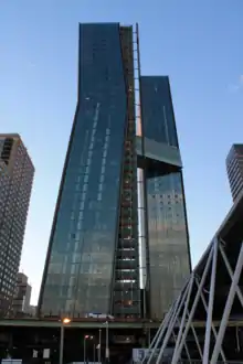 The north and south elevations of the building's facade are clad in copper, while the east and west elevations are floor to ceiling glass. The two towers are designed such that they appear to "dance" with each other.[1] They are connected by a bridge approximately 300 feet from the ground, three levels in height.[20] The west tower is 540 feet in height, and the east tower is 470 feet tall.[2]