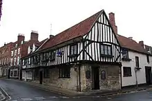 The Blue Pig pub, on the corner of Vine Street and Swinegate. The ground storey is stone-faced, with the upper floor, overhanging the lower, having an exposed timber frame.[1] The timbers were exposed, by removing rendering that had previously covered them, in the early 1930s.[2]