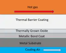 Thermal barrier coatings (TBCs) are advanced materials systems usually applied to metallic surfaces on parts operating at elevated temperatures, such as gas turbine combustors and turbines, and in automotive exhaust heat management. These 100 μm to 2 mm thick coatings of thermally insulating materials serve to insulate components from large and prolonged heat loads and can sustain an appreciable temperature difference between the load-bearing alloys and the coating surface.[1] In doing so, these coatings can allow for higher operating temperatures while limiting the thermal exposure of structural components, extending part life by reducing oxidation and thermal fatigue. In conjunction with active film cooling, TBCs permit working fluid temperatures higher than the melting point of the metal airfoil in some turbine applications. Due to increasing demand for more efficient engines running at higher temperatures with better durability/lifetime and thinner coatings to reduce parasitic mass for rotating/moving components, there is significant motivation to develop new and advanced TBCs. The material requirements of TBCs are similar to those of heat shields, although in the latter application emissivity tends to be of greater importance.