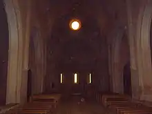 Inside, the church consists of a main nave with three bays covered with a pointed barrel vault, and two side aisles. The arches supporting the vault rest upon half-columns, which rest upon carefully carved stone bases about two meters halfway up the walls of the nave.