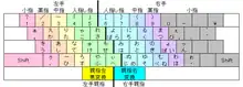 The thumb-shift keyboard (親指シフト, oyayubi shifuto) is a keyboard design for inputting Japanese sentences on word processors and computers. It was invented by Fujitsu in the late 1970s and released in 1980 as a feature of the line of Japanese word processors the company sold, named OASYS, to make Japanese input easier, faster and more natural.[1][2] It is popular among people who input large quantities of Japanese sentences, such as writers, playwrights, lawyers and so on, because of its ease of use and speed. The rights regarding the use of this design were transferred to Nihongo Nyuuryoku Consortium (Japanese Input Consortium), a technology sharing cooperative of interested companies, in 1989. It is referred to as an example of keyboard layout in Japanese Industrial Standards.[3]