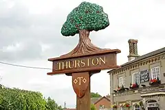 The village is recorded in the Domesday Book as having a population of 66 households. It was part of the lands of the Abbey of Bury St Edmunds, then one of the largest landlords in England.[3][4] Thurston was located in the middle of Thedwastre Hundred, an administrative district in the middle ages. The town sign depicts a tree, representing "Theodwards’s tree". This tree may have been the meeting place of the Hundred Court in Thedwastre Road, Thurston.[5]