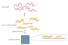 Several different methods exist for tiling an array. One protocol for analyzing gene expression involves first isolating total RNA. This is then purified of rRNA molecules. The RNA is copied into double stranded DNA, which is subsequently amplified and in vitro transcribed to cRNA. The product is split into triplicates to produce dsDNA, which is then fragmented and labeled. Finally, the samples are hybridized to the tiling array chip. The signals from the chip are scanned and interpreted by computers.