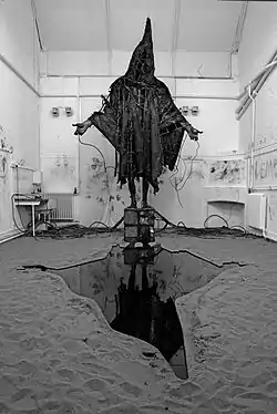 The influence of myth, seen in Shaw's early work, is once again present in his 2008 sculpture, Minotaur, a piece that was commissioned to mark the opening of Harrison Birtwistle's Opera, The Minotaur.[7] After this, however, the more political side to his work becomes increasingly evident with a number of sculptures responding to issues such as terrorism and the war in Iraq.[8] At this time Shaw was working in London as a Fellow sculptor at the Kenneth Armitage Foundation. The main works he produced during this 2006 to 2008 residency were Man on Fire: What God of Love Inspires Such Hate in the Hearts of Men, Tank on Fire (awarded the selectors' choice Threadneedle prize in 2008),[9] and the multi-sensory installation Casting a Dark Democracy – Shaw's haunting response to the now infamous image of the Abu Ghraib prisoner, described as "one of too few works to engage unequivocally with the reality and human cost of the Iraq war."[10]
