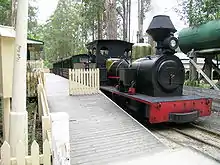 The key attraction of Timbertown is the 595mm[2] narrow gauge[3] Timbertown Heritage Railway, with a John Fowler & Co. saddle tank 0-4-2t steam locomotive (“Ruby”) built in 1928,[4] that operates on a short circuit track within and around the town.