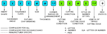 Inserts used for turning and milling are often numbered according to ISO standard 1832. This standard aims to make the naming, specifying and ordering of inserts a simple, consistent and traceable process. This standard takes into account both metric and imperial systems of units, although certain elements differ for each unit system. The code consists of up to 13 symbols with the first 12 of them being compulsory for inserts composed of cubic boron or poly-crystalline diamond and the first 7 being compulsory for all other types of composition.[2]