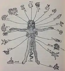 Tonalli, along with teyolia and ihiyotl, was believed to direct the physiological process of the human body. It gave a person character, and was highly valued by the family and sought after in warfare and ritual sacrifice. It was believed that tonalli could be taken from a human body and either offered to the gods as a form of debt payment or acquired by the ritual person who touched the physical entity in which they resided.[1] The concept of tonalli was not only limited to human beings. It infiltrated animals, gods, plants, and objects used in rituals.[2]