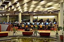 Energy conservation methods were employed in the design of the interior and its HVAC systems.[6] The building climate is regulated through an internal heat pump system that recovers the heat from its lights, visitors, and the solar radiation that passes through the window.[6] The open-space curved central atrium features a skylight and is also designed to allow air to circulate freely.[6] Spread throughout the central atrium are plant and water features, inspired by the Hanging Gardens of Babylon.[4][7]