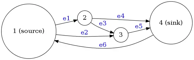 This matrix arises as the coefficient matrix of the constraints in the linear programming formulation of the maximum flow problem on the following network: