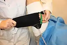 In the 2000s, the silicon ring tourniquet, or elastic ring tourniquet, was developed by Noam Gavriely, a professor of medicine and former emergency physician.[30][31] The tourniquet consists of an elastic ring made of silicone, stockinet, and pull straps made from ribbon that are used to roll the device onto the limb. The silicone ring tourniquet exsanguinates the blood from the limb while the device is being rolled on, and then occludes the limb once the desired occlusion location is reached.[1] Unlike the historical mechanical tourniquets, the device reduces the risk of nerve paralysis.[32][33] The surgical tourniquet version of the device is completely sterile, and provides improved surgical accessibility due to its narrow profile that results in a larger surgical field. It has been found to be a safe alternative method for most orthopedic limb procedures, but it does not completely replace the use of contemporary tourniquet devices.[34][35] More recently the silicone ring tourniquet has been used in the fields of emergency medicine and vascular procedures.[31][36]