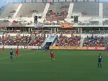 In the 1930s, a new North Carolina State University research farm supported Cary's farmers.[20] One Cary garden club began growing gourds and showed their products and related crafts at the North Carolina State Fair.[44] After the club's first annual Gourd Festival in 1944, they sent exhibits to the International Gourd Society Festival in Pasadena, California and took many prizes[45] This earned Cary the nickname "Gourd Capital of the World", a designation reflected by gourds circling the original version of the town seal.[44][26] Now named North Carolina Gourd Festival, the annual event moved to the North Carolina State Fairgrounds in 2000.[46][47][48]