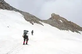What faces a visitor to Pindari glacier at the Zero Point, along its left lateral moraine, is an immense wall of jagged, broken ice criss-crossed with thousands of seracs and crevasses. The upper icefields of the glacier are invisible from there and the near level ice mass at its lower end at the snout below recedes into insignificance. What people call the Pindari glacier is actually a huge icefall passing over a steep slope, through which a direct ascent has yet to be made. Above this lie the icefields of the surrounding heights and the névé basin of the glacier, some 8 km long, separated from the ridge above with a text-book fashion bergschrund. The lowest point on the ridge at 5312 m is the Trail's Pass. Beyond the pass to the north and east lies the Lwan valley whose catchment is the Gori ganga valley.
