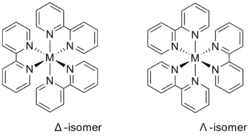 Bipyridine complexes absorb intensely in the visible part of the spectrum. The electronic transitions are attributed to metal-to-ligand charge transfer (MLCT). In the "tris(bipy) complexes" three bipyridine molecules coordinate to a metal ion, written as [M(bipy)3]n+ (M = metal ion; Cr, Fe, Co, Ru, Rh and so on). These complexes have six-coordinated, octahedral structures and exists as enantiomeric pairs: