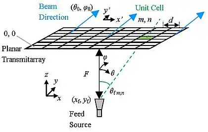A conventional transmitarray consists of a planar arrangement of unit cells, illuminated by a feed source. For this structure, the required phase distribution is:[4][29]