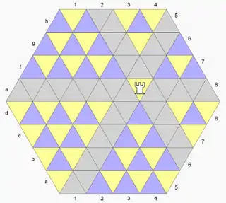 The starting setup is as shown. As in chess, White moves first, and the object is checkmate. Other standard conventions apply as well, including castling, the pawn's initial two-step move, the en passant capture, and promotion at the last rank. The triangular geometry, however, implies special move patterns for the pieces.