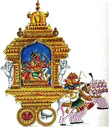 Here, the five-headed Tripurantaka is seen pointing an arrow towards the Tripura (rightmost top corner) with the bow made of Mount Meru, the serpent Vasuki is seen as its string. The four headed god Brahma is seen as the charioteer. The moon and the sun are depicted as the wheels of the chariot.