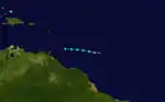 A low-latitude tropical wave emerged into the Atlantic from the west coast of Africa on June 13. Initially accompanied by a large area of convection, the showers and thunderstorms quickly diminished by later that day. After an increase in shower and thunderstorm activity later on, as well as the development of a well-defined circulation, the system was classified as Tropical Storm Bret while located about 185 mi (298 km) east-southeast of Trinidad at 18:00 UTC on June 19. Bret intensified slightly further, peaking with maximum sustained winds of 50 mph (85 km/h) around 02:00 UTC the following day. Simultaneously, the storm made landfall in southwestern Trinidad. After briefly emerging in the Caribbean, Bret made another landfall on the Paria Peninsula of Venezuela around 09:00 UTC on June 20. Increasing wind shear, the storm's relatively fast forward speed, and land interaction caused Bret to dissipate about three hours later.[50] The remnants later contributed to the formation of Hurricane Dora in the eastern Pacific.[51]