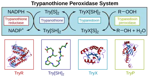 A major function of trypanothione is in the defence against oxidative stress.[7] Here, trypanothione-dependent enzymes such as tryparedoxin peroxidase (TryP) reduce peroxides using electrons donated either directly from trypanothione, or via the redox intermediate tryparedoxin (TryX). Trypanothione-dependent hydrogen peroxide metabolism is particularly important in these organisms because they lack catalase. Since the trypanosomatids also lack an equivalent of thioredoxin reductase, trypanothione reductase is the sole path that electrons can take from NADPH to these antioxidant enzymes.