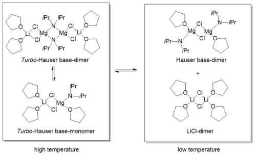 Knochel et al. proposed that LiCl increases the reactivity of Turbo-Grignard compounds RMgCl·LiCl (R = alkyl, aryl or vinyl) by giving the reactive bimetallic monomer a magnesiate character in sense of a solvent separated ion pair (SSIP) [Li(THF)4]+ [RMg(THF)Cl2]−.[1][11] In case of the above mentioned Turbo-Hauser bases where the alkyl group of a Grignard is replaced by an amido group (R = R'2N−) this hypothesis could not be confirmed because no SSIP [Li(THF)4]+ was detectable.