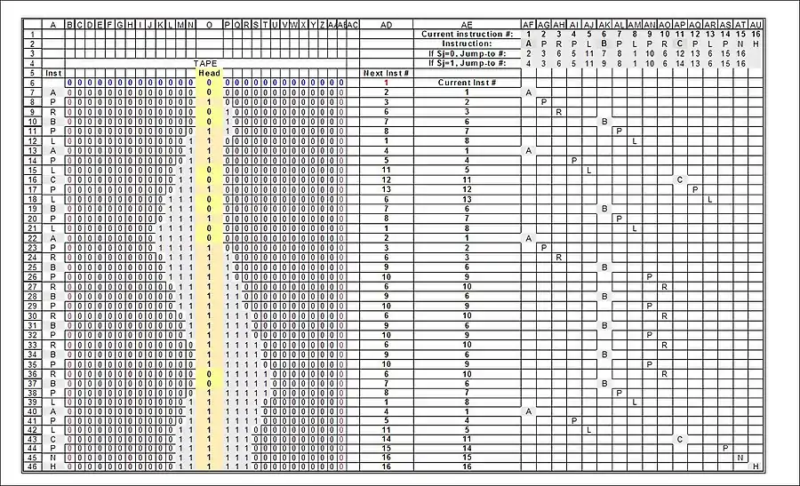 The full "run" of the 3-state busy beaver. The resulting Turing-states (what Turing called the "m-configurations" — "machine-configurations") are shown highlighted in grey in column A, and also under the machine's instructions (columns AF-AU)):
