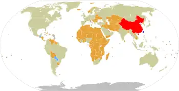 PRC government policy mandates that any country that wishes to establish a diplomatic relationship with the PRC must first discontinue any formal relationship with the ROC. According to The Fletcher Forum of World Affairs, "non-recognition of the Taiwanese government is a prerequisite for conducting formal diplomatic relations with the PRC—in effect forcing other governments to choose between Beijing and Taipei."[10][11] In order to compete for other countries' recognition, each government has given money to certain small countries. Several small African and Caribbean countries have established and discontinued diplomatic relationships with both sides several times in exchange for huge financial support from each side.[12] The PRC also uses its international influence to prohibit the ROC from entering international events such as the Olympic Games under its official name. Instead, the ROC was forced to adopt the name Chinese Taipei to enter such events since the 1980s.[13] Furthermore, on press releases and other media, the PRC never refers to the ROC as such, instead referring to the territory of Taiwan as "China's Taiwan Province", and to the ROC government as "the Taiwan authority".