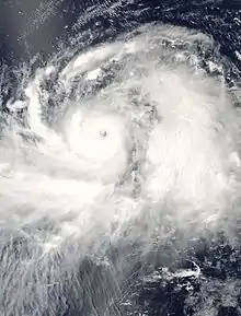 At 1800 UTC on August 20, the JMA upgraded Chaba to typhoon status,[2] while the system was roughly 345 km (214 mi) east-southeast of Saipan.[1] Much of the rapid intensification pattern was attributed to the development of dual outflow channels during the day's course. Concurrently Chaba began to curve towards the northwest around the periphery of the nearby, dominant subtropical ridge in response to an approaching longwave,[3] sweeping past the Mariana Islands.[1] At 1800 UTC on August 23, the JMA assessed the typhoon to have reached its peak intensity with maximum sustained winds of 205 km/h (127 mph) and a minimum barometric pressure of 910 mbar (hPa; 26.87 inHg).[2] An intense albeit average-sized typhoon, Chaba held this intensity for two days before dry air began to impact the cyclone. On August 26, the typhoon's convection slightly weakened, and the more intense convective activity became limited to the southern and eastern sides of the system.[1]