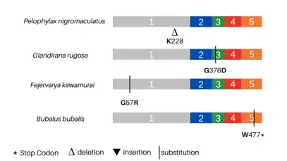 While albinism is common, there have only been a few studies about the genetic mutations in the tyrosinase genes of animals. One of them was on Bubalus bubalis (water buffalo). The tyrosinase mRNA sequence of the wild-type B. bubalis is 1,958 base pairs (bp) with an open reading frame (ORF) of 1,593 bp long, which translates to 530 amino acids. Meanwhile, the tyrosinase gene of the albino B. bubalis (GenBank JN_887463) is truncated at position 477, caused by a point mutation in nucleotide 1431 which converts a Tryptophan (TGG) into a stop codon (TGA), resulting in a shorter and inactive tyrosinase gene.[24] Other albinos have point mutations that appear to inactivate Tyrosinase without truncation (see table and figure for examples).