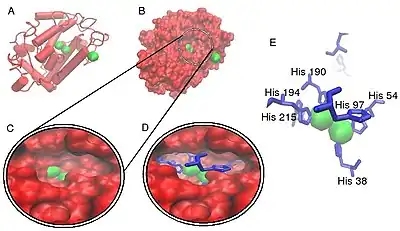 Crystallographic structure of a Streptomyces-derived tyrosinase in complex with a so-called "caddie protein".[8] In all models, only the tyrosinase molecule is shown, copper atoms are shown in green and the molecular surface is shown in red. In models D and E, histidine amino acids are shown as a blue line representation. From model E, each copper atom within the active site is indeed complexed with three histidine residues, forming a type 3 copper center. From models C and D, the active site for this protein can be seen to sit within a pillus formed on the molecular surface of the molecule.