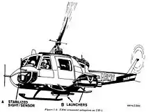 The M3, sometimes referred to as "Aerial Rocket Artillery" (ARA), consisted of two 2.75" 24-Tube rocket launchers, one on either side of the aircraft, along with a Mk 8 sight. The launchers fired in pairs, one from each side to prevent the aircraft from becoming off balance. M3 systems were attached to the helicopter using Bell designed stores racks.[2][3] The only difference between the XM3 and XM3E1 was that the launch tubes on the E1 were 4" longer. The XM3E1 was standardized as the M3.[3]