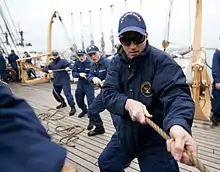 Eagle has a standing permanent crew of seven officers and 50 enlisted members; on training missions, she takes on a variety of temporary crew and sails with an average complement of 12 officers, 68 crew, and up to 150 trainees.[21] While on board, cadets and officer candidates receive a large amount of instruction from the crew. They take classes on numerous subjects that are key to life at sea, including navigation, seamanship, ship and boat maneuvering, line handling, sailing, first aid, weather patterns, damage control, engineering, career development, and more. They also stand watches in the engine room, on the bridge, on deck, in the scullery and galley, and during port calls, they assist the public by giving tours. The trainees are expected to qualify in a variety of watchstations applicable to their level of experience; for example, third class cadets complete their 'helm and lookout' qualification while upper-class cadets work to qualify in leadership positions on the bridge and in the engine room. At the same time, trainees are given a rigorous set of nautical tasks they must complete. One common training task involves the Eagle crew covering all Global Positioning System receivers on board and requiring trainees to navigate between ports using sextants, a compass, and the tools of celestial navigation.[22][23]