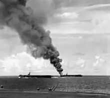 In a photograph likely taken onboard the flight deck of Petrof Bay, the escort carriers Santee and Suwannee are depicted. The burning carrier is Suwannee, which had been previously hit by two kamikazes.