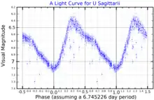 U Sagittarii is a variable star in the southern constellation of Sagittarius, abbreviated U Sgr. It is a classical Cepheid variable that ranges in brightness from an apparent visual magnitude of 6.28 down to 7.15, with a pulsation period of 6.745226 days.[3] At its brightest, this star is dimly visible to the naked eye. The distance to this star is approximately 2,080 light years based on parallax measurements,[2] and it is drifting further away with a radial velocity of 2 km/s.[6]
