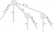 - Construct T3 for S[1...3] by adding suffixes of xab (xab, ab and b). Rule 1 applies, which extends the path label in existing leaf edge. Rule 2 applies, which creates a new leaf node.
