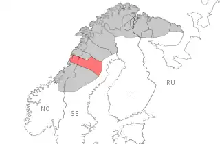 ![]() Ume Sami language area (red) within Sápmi (grey) | |
