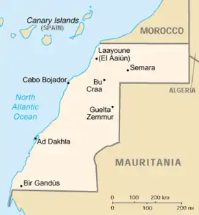 ![]() Western Sahara (highlighted) surrounded by Morocco and Mauritania | ||