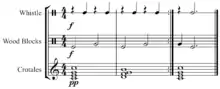 Three instruments on the spectrum between pitched and unpitched: whistle, woodblocks, crotales Play