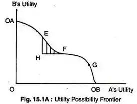 In welfare economics, a utility–possibility frontier (or utility possibilities curve), is a widely used concept analogous to the better-known production–possibility frontier. The graph shows the maximum amount of one person's utility given each level of utility attained by all others in society.[1] The utility–possibility frontier (UPF) is the upper frontier of the utility possibilities set, which is the set of utility levels of agents possible for a given amount of output, and thus the utility levels possible in a given consumer Edgeworth box. The slope of the UPF is the trade-off of utilities between two individuals.[2] The absolute value of the slope of the utility-possibility frontier showcases the utility gain of one individual at the expense of utility loss of another individual, through a marginal change in outputs.[2] Therefore, it can be said that the frontier is the utility maximisation by consumers given an economies' endowment and technology.[3] This means that points on the curve are, by definition, Pareto efficient, which are represented by E, F and G in the image to the right. Meanwhile the points that do not lie on this curve are not Pareto efficient, as shown by point H.[3] The utility possibility frontier also represents a social optimum, as any point on the curve is a maximisation of the given social welfare function.[3]